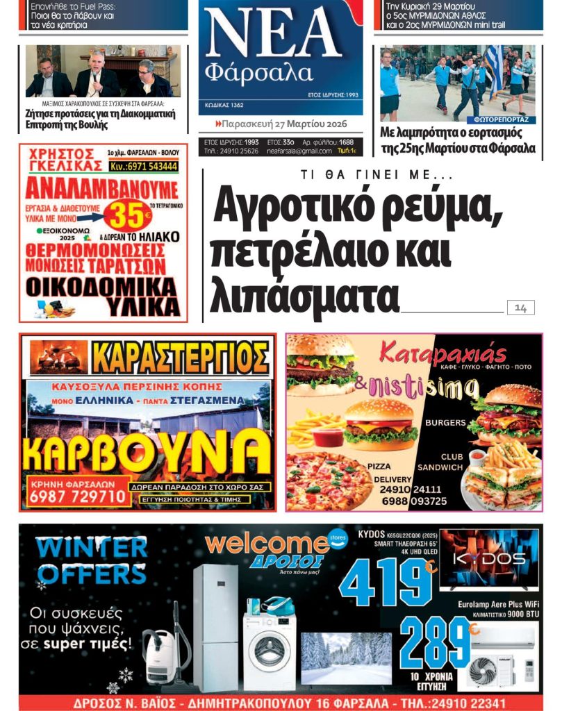 Από τον Εμπορικό Επιχειρηματικό Σύλλογο Επαρχίας Φαρσάλων ανακοινώνεται ότι με την εφαρμογή της θερινής ώρας το ωράριο των καταστημάτων από την Δευτέρα 30 Μαρτίου 2026 –Περισσότερα…