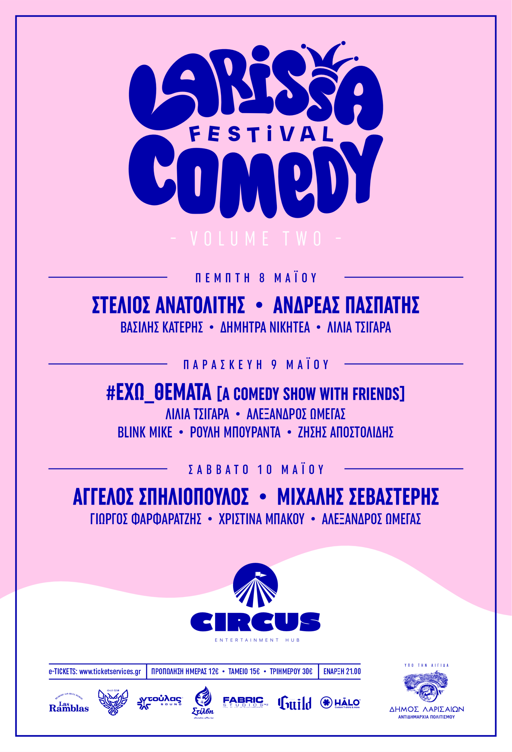 Το Larissa Comedy Festival επιστρέφει για δεύτερη χρονιά, υπό την αιγίδα της Αντιδημαρχίας Πολιτισμού του Δήμου Λαρισαίων και ανοίγει τις πόρτες του στις 8, 9 και 10 Μαΐου, εμφανώς ανανεωμένο, στο Circus Entertainment Hub (Ερυθρού Σταυρού 4), για να υποδεχτεί δεκατρείς stand-up κωμικούς από όλη την Ελλάδα.